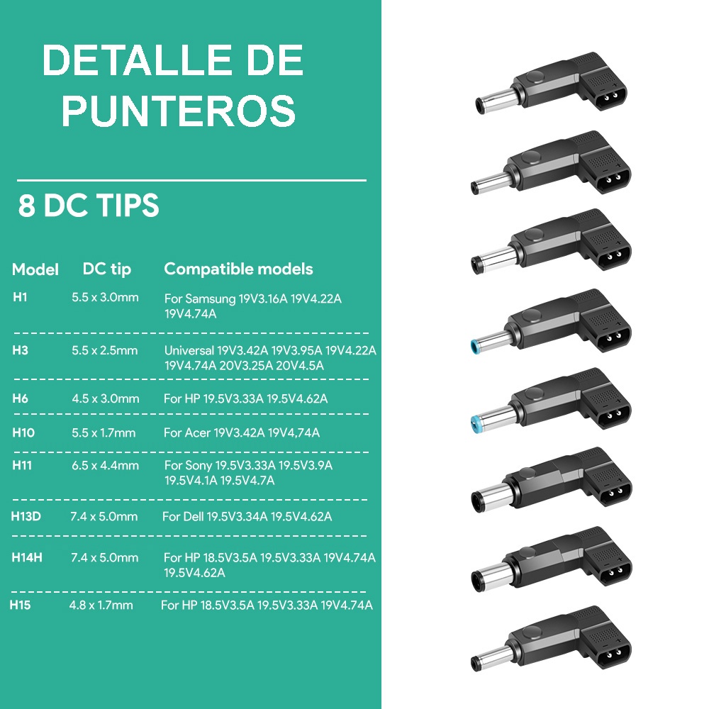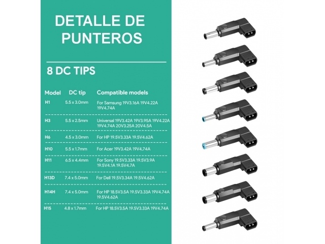 Cargador Universal compatible con una gran cantidad de marcas y modelos de Laptop.